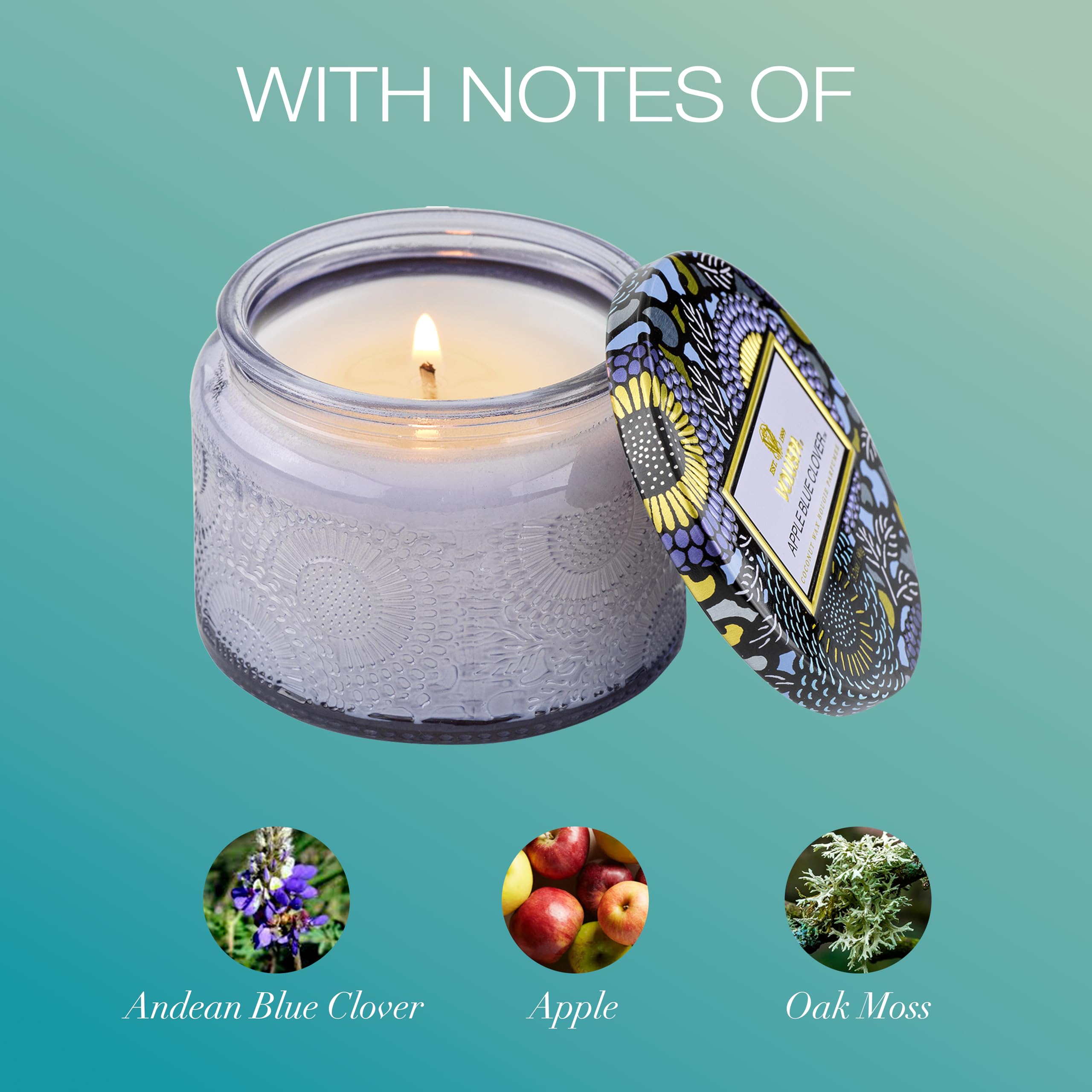 Voluspa Apple Blue Clover, Petite Candle Jar, 3.2 oz, 25 Hour Burn Time, Coconut Wax for Clean Burning, Handcrafted in The USA