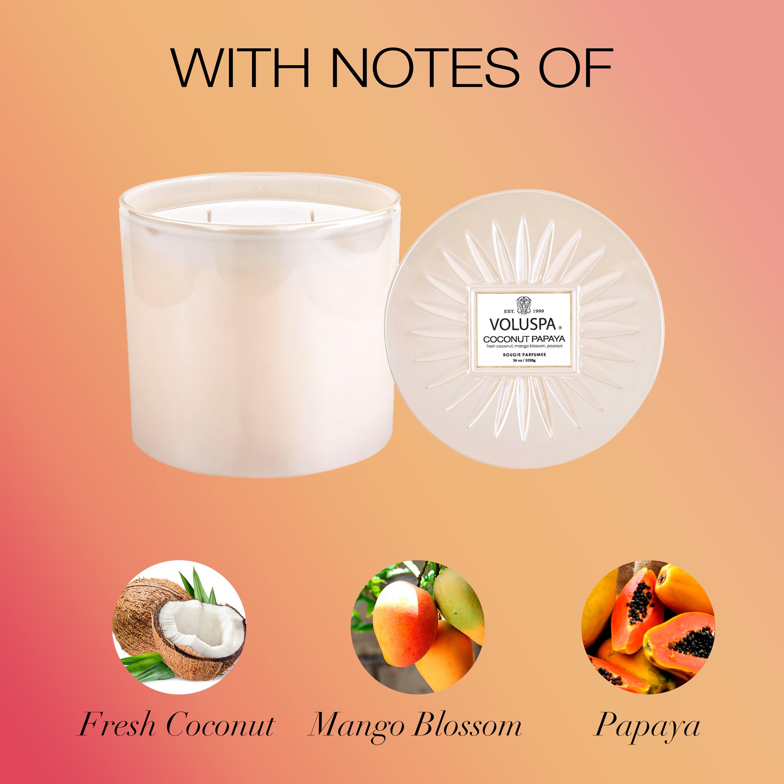 - Versatile Gift: Send this Coconut Papaya scented beautiful candle to family, friends or yourself; these home luxury 3 wick glass candle gifts are perfect for anniversaries, birthdays, housewarmings and more