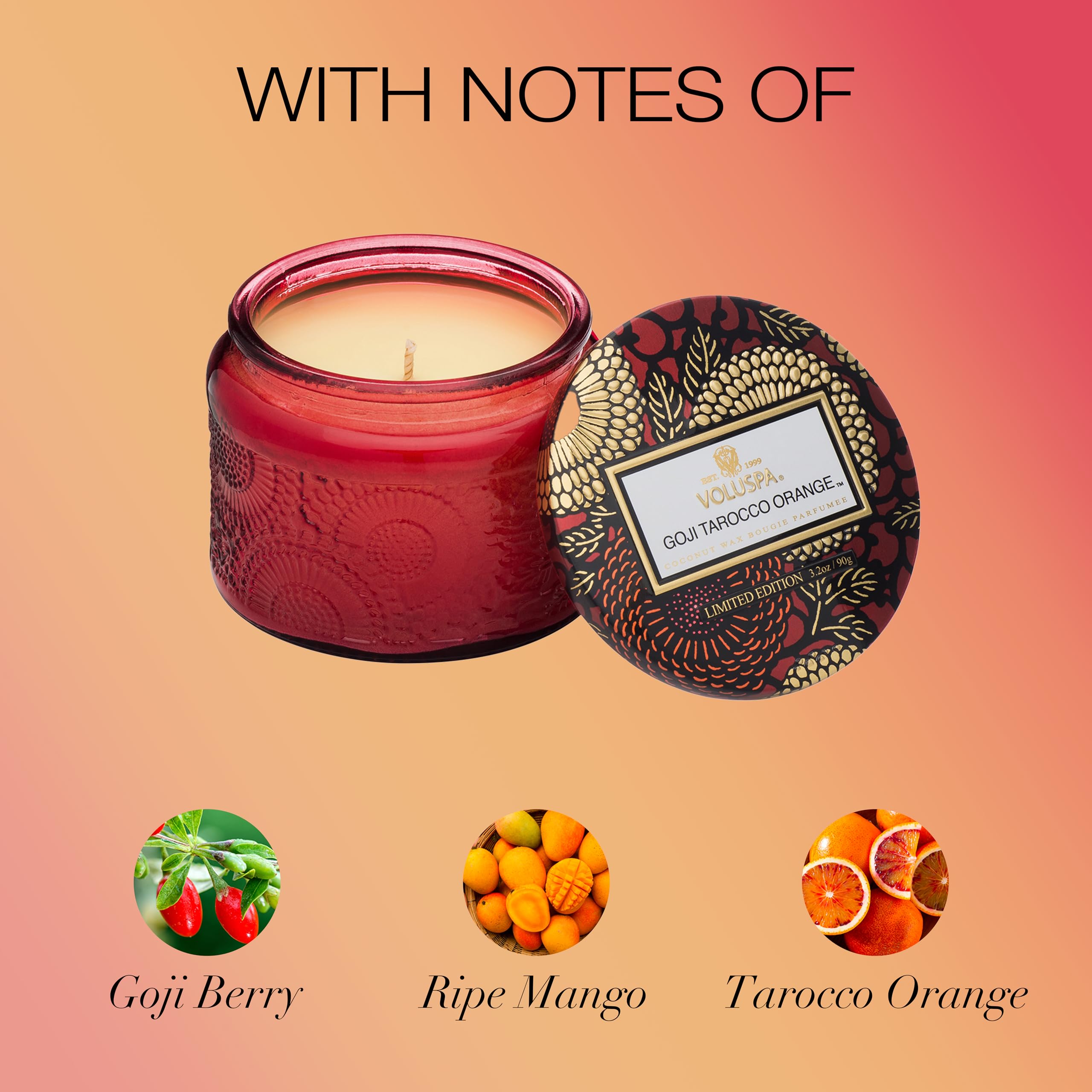 - Beautifully Scented: Soothe your senses with the aromatic Goji Tarocco Orange candle - this citrus & fruity petite candle comes in an ideal 3.2 oz size