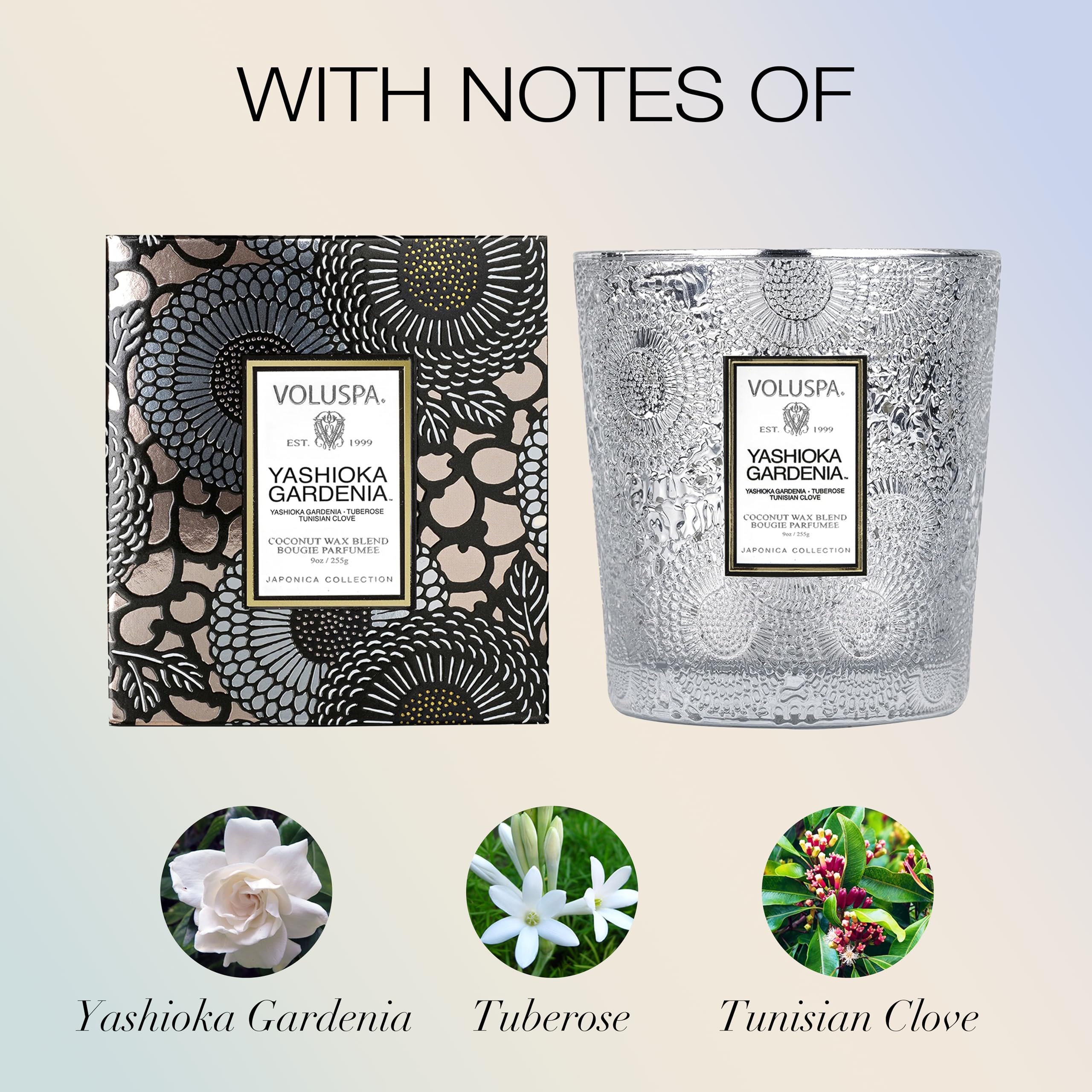 Voluspa Yashioka Gardenia, Classic Boxed Candle, 9 Ounce, 60 Hour Burn Time, Coconut Wax for Clean Burning, Handcrafted in the USA